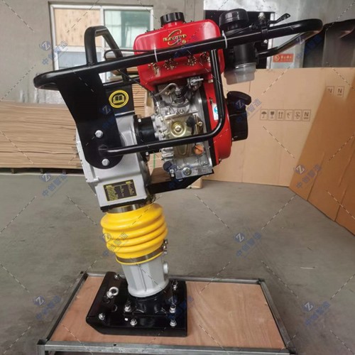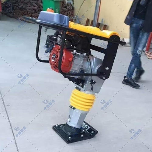 冲击夯的动力汽油机轴直接付给齿轮轴,然后带动曲轴齿轮转动,通过连杆带动活塞体一下往复运动,由于弹簧对其能量的吸收和释放,致使夯机快速跳动以达到对地面的压实效果,同时由于夯机本身做了特定的前倾角度设计,致使机器在快速运动的同时能自行向前行走。
